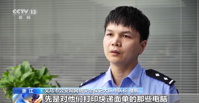 义乌市公安局网络安全保卫大队中队长 楼帆:我们到了云仓,先是对他们打印快递面单的那些电脑进行了勘查。勘查之后我们发现电脑上被安装了木马软件,它这个木马软件一边电脑在打印,一边就把那个数据上传到服务器上去。