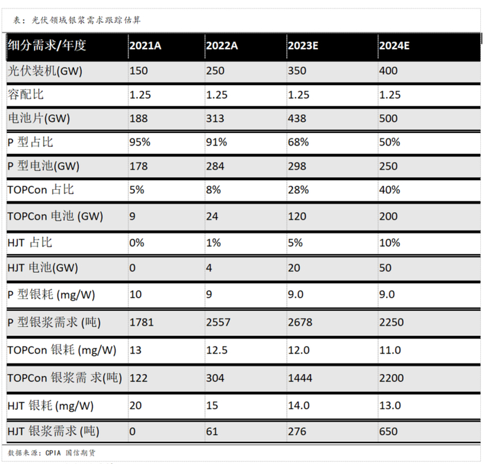 根据ITRPV数据统计显示,P 型电池正面银浆消耗量约 70mg/片,背面银浆消耗量约30mg/片;N型HJT电池单体用银量最大是P型电池银需求量的2.5倍;其次是N型TOPCon电池,约P型电池银需求量的1.5倍。随着N型电池的大规模扩张,白银需求大概率显著增加。