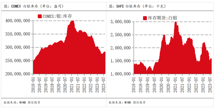 截至2023年8月9日,COMEX白银库存为281,306,895.75盎司,较2023年初减少19472880.29盎司,白银库存减少。截至2023年8月9日,上期所白银库存为1,510,038.00千克,较2023年年初下降644510千克,白银库存下降。