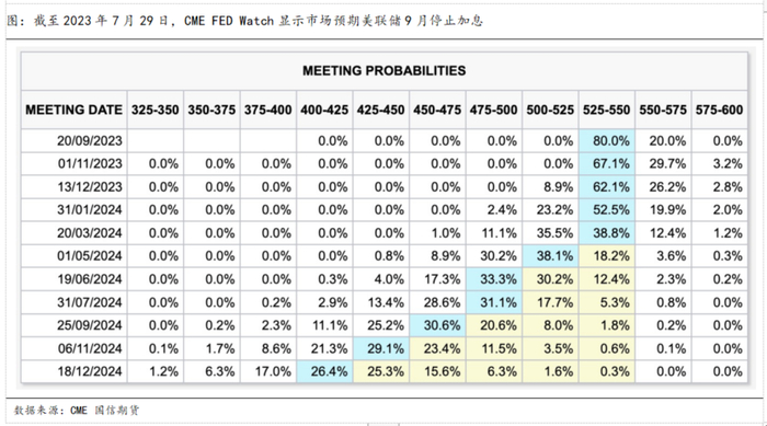 此外,在7月利率决议的新闻发布会上,美联储主席鲍威尔再次释放9月货币政策将取决于经济数据,并强调美联储并没有调整2%的通胀目标,但却也肯定了目前美国通胀已经显著下滑。截至7月29日,据CME FedWatch显示,目前市场对美联储9月不加息的预期概率已超过80%。