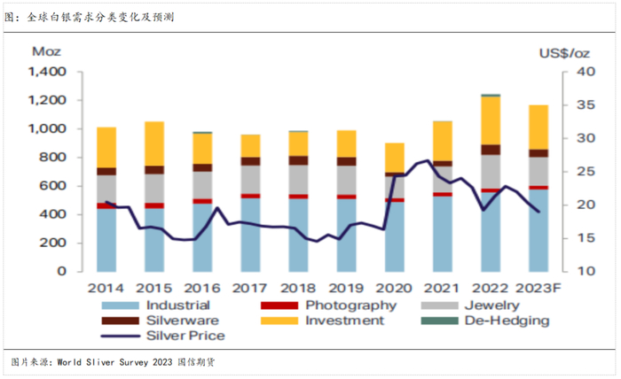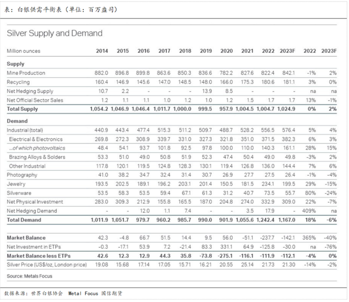 需求端的主要增量则主要来源于光伏板块,预计将从2022年的140.3百万盎司上升至161.1百万盎司,同比上升15%;此外,电子电器等其他工业需求也用小幅增长。然而,2022年同比增长较多的银器、珠宝首饰和实物投资预计在今年都将有不同程度的下降,其中银器预计降幅最大、同比将下降约24%。