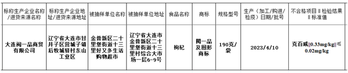 辽宁省市场监督管理局公布的2023年第7期食品抽检信息显示,标称大连闽一品商贸有限公司生产的“闽一品”枸杞(生产日期:2023/4/10)被检出克百威项目不合格。