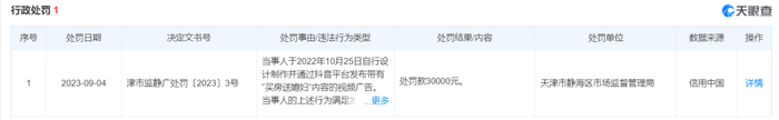 天眼查显示,天津静海万海置业有限公司(下称“万海置业”)此前通过抖音平台发布带有“买房送媳妇”内容的视频广告,在9月4日被天津市静海区市场监督管理局采取行政处罚,罚款3万元。
