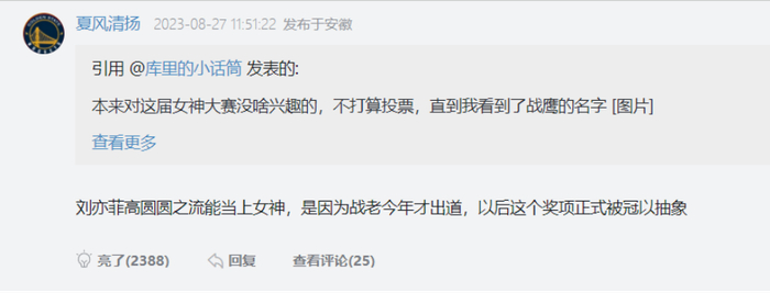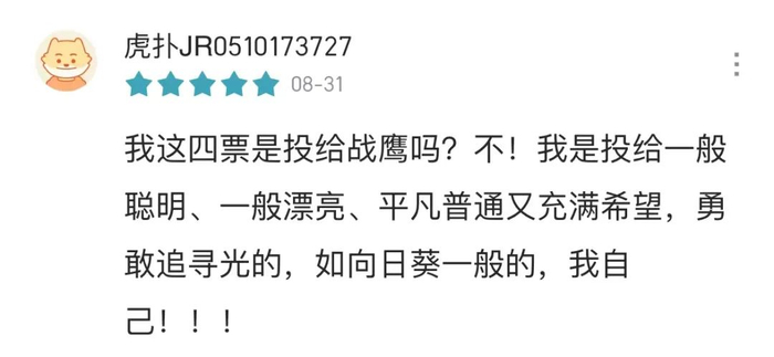还有老铁表示,“本来不打算投票,直到看到了战鹰的名字”,“以前刘亦菲高圆圆之流能夺冠,是因为战鹰今年才出道”。