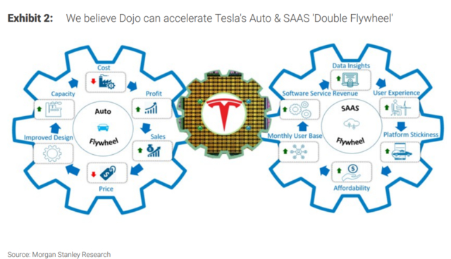 摩根士丹利在报告中指出,Dojo对于特斯拉估值的提振主要体现在两方面:汽车和自动驾驶软件,即Dojo是特斯拉“硬件和软件之间的交叉点”。