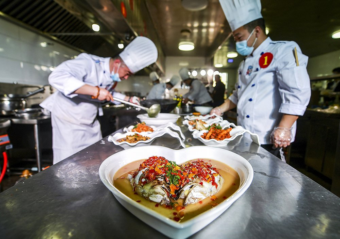 2022年1月16日,新疆阿勒泰,福海县一宾馆后厨,参赛选手用当地的野生鱼烹饪美食。当日,新疆阿勒泰地区2022年“魅力乌伦古·寻味冰川鱼”乌伦古湖冰川鱼烹饪大赛在福海县举办,参赛选手需利用乌伦古湖中的野生鱼,在规定时间内完成两道菜品的制作。