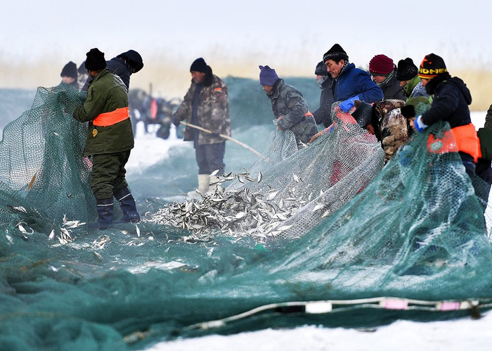 2019年1月4日,新疆阿勒泰,福海县乌伦古湖已是千里冰封,当地渔民冒着零下20℃以下的低温,利用工具凿冰眼、下网、穿杆、走线,将千米大网布置于冰面之下,当天的冰上大拉网共捕获各种鱼类3吨左右。冬季冰上大拉网捕鱼是乌伦古湖的传统捕鱼方式,这种场景在中国仅现于东北查干湖和福海乌伦古湖,场面壮观,极具观赏性。捕捞期为每年12月中下旬至次年3月初。