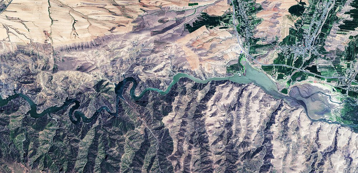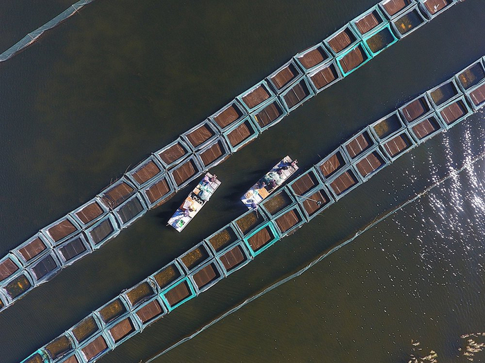 2023年7月13日,吉林一号卫星拍摄的新疆伊犁尼勒克县喀拉苏村喀什河海鲜养殖区。此地利用水温常年低于20摄氏度的喀什河,采用环保网箱养殖和机械化捕捞等现代化渔业方式,养殖三文鱼并获得丰收。