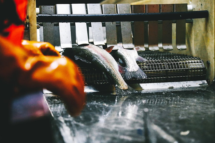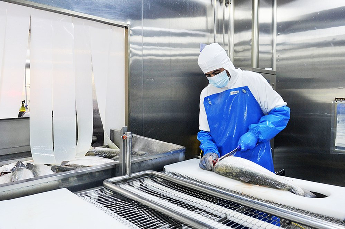2020年9月26日,新疆维吾尔自治区尼勒克县,三文鱼养殖基地的三文鱼打捞加工生产线。