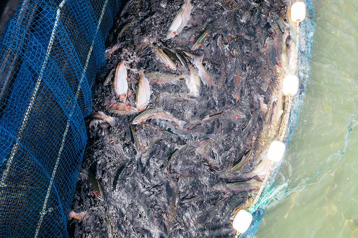 2020年9月26日,新疆维吾尔自治区尼勒克县,三文鱼养殖基地,工作人员正在对成熟三文鱼进行打捞。
