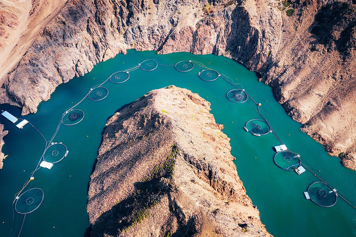 2020年9月26日,新疆维吾尔自治区尼勒克县,三文鱼养殖基地,三文鱼环保养殖网箱。