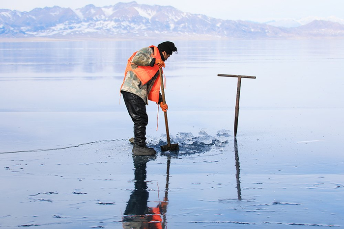 2022年1月15日,新疆赛里木湖渔业工人正在凿冰下网,做捕鱼准备工作。据赛湖渔业捕捞工人介绍,冬季捕鱼比较难,原因是湖面全部封冻,需要凿冰捕鱼,先依次在冰面上开凿许多冰洞,水下布上200多张粘网,三天后才起网。一起可以捕捞鱼700至900公斤左右,最多的一次达到2.2吨。新疆博尔塔拉蒙古自治州境内的赛里木湖,水质优良,具有得天独厚的冷水鱼养殖的天然,1998年开始,赛湖渔业依托赛里木湖冷水资源,坚持发展生态渔业,承担国家冷水鱼良种繁育及水产良种场建设项目,先后建成国家“健康养殖示范场”、国家“高白鲑保种繁育基地”。改写了赛里木湖无商品鱼历史,并将渔业产品扩展至3大类30多个品种。