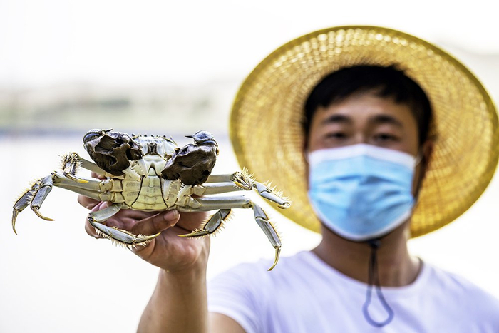 2020年9月7日,新疆巴州,在尉犁县罗布湖,当地渔民展示收获的螃蟹。