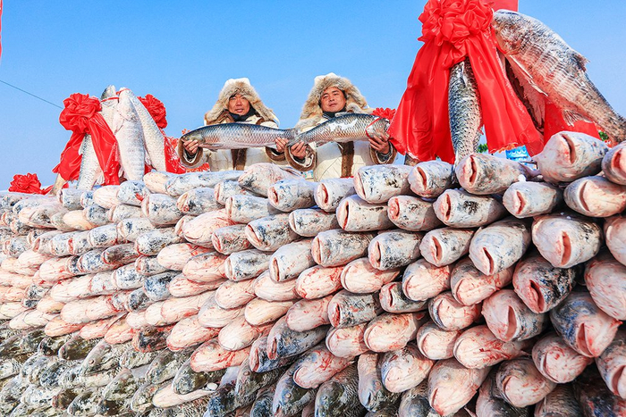 2023年1月15日,新疆巴州,渔民展示冬捕作业的成果。