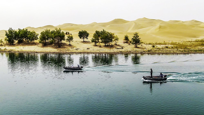 2020年9月7日,新疆巴州,在尉犁县罗布湖,游客驾驶路亚艇前往垂钓水域。