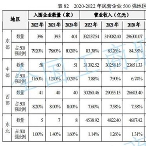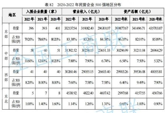 东部地区历来民营经济发达。报告显示,2022年,东部地区共有396家企业入围民企500强,占总量的79.2%。尽管数量比上年增加了3家,仍未回到2020年水平,还有“5家”缺口。