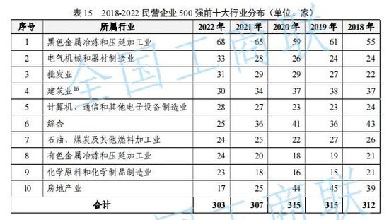 结合行业分布来看,民企500强前十大行业共包括13个细分行业、303家企业。其中,“黑色金属冶炼和压延加工业”继续位居第一,“电气机械和器材制造业”和“批发业”排名有所上升,分列第二、第三位。