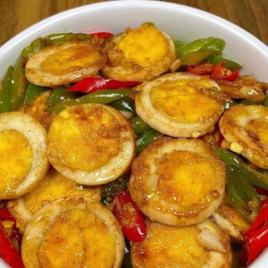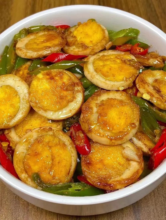 在一众湖南鸡蛋料理里,金钱蛋的做法也很有代表性——原材料朴实无华,不沾一点荤腥,然而只需一点巧劲儿,就能让它蜕变成比肉还香的下饭菜:用丝线替代菜刀,能把水煮蛋精细地切割成片;在不多不少的热油里缓慢推动蛋片,它便镀上金黄的虎皮外壳、有了外酥里嫩的完美口感;再伴上蒜叶和辣椒一同爆炒,连带着汤汁一同盛出来,必然会收获家人的目光致礼,这么一碗端上桌去,没多久就要被哄抢一空。