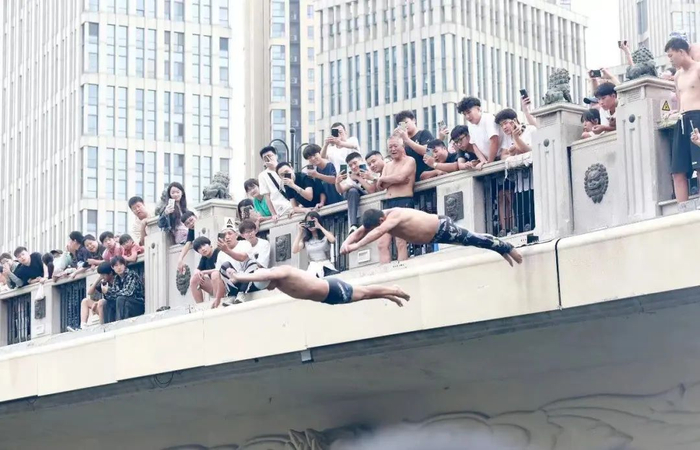 在2021年的抖音视频里,跳水队就已经有了报幕的传统。当时的口号与如今各大网红视频里人群高声附和的并无二样,有些一个字都没有改动。站在桥栏外的人们享受着入水前那短暂的被关注的感觉,站在高处的感觉。