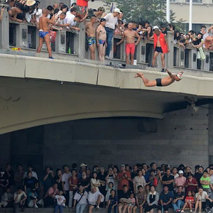 几个穿红马甲的志愿者也来了,说是事业单位抽调的,来维持秩序。蓝天救援队和消防队也开着小艇来了,定在桥下,随时准备着。有人横躺着拍下来,入水的瞬间失去了意识,岸边的大爷们赶紧把人给捞起来,当地蓝天救援队在接受采访时说,仅九月第一个周末,就救起14名跳水观众,其中有7人因跳水姿势不对出现昏迷,5人溺水,2人突发疾病。