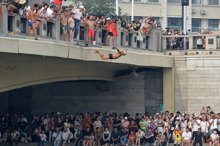 年少的孩子掌握不了华丽的动作,就是「冰棍式」——特指人绷直身体,自由落体式地掉进水里。每个跳水的人都能记得自己第一跳的场景,记忆都是相似的:身体歪斜,入水被拍得生疼,上岸就是一片红。慢慢学会了小燕飞、镰刀式,有的胆子大的,还要在空中转几圈才入水。去海河跳水,也成为了老人们生活的一部分。