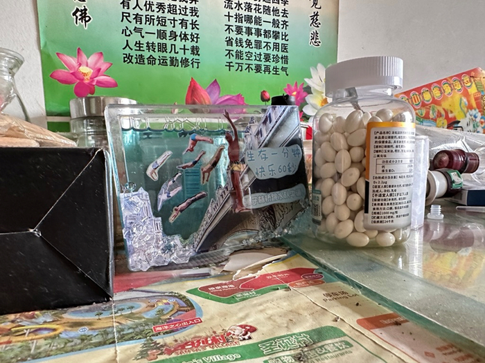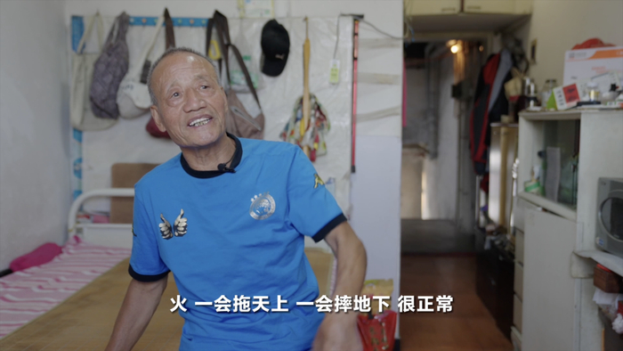 2002年,海河边旧房拆建,原先住在胡同里的苏家被分到了这里。苏长海说,这里是养老院改建的,小区周围很破,临街的商店都是平房,还有几家卖寿衣的店。楼里面的构造像是几个筒子楼打通,进了一个门栋,还要七拐八拐,再上个楼梯,才能到他的家。楼道墙上贴着老旧的彩色的宣传纸,宣传公共卫生,防护清理梅毒之类。进入他的家,房间很小,只有20平米,最拥挤的时候,苏长海和妻子、没成家的儿子都横挤在一张床上,伸出去落空的脚,要再垫一个凳子。