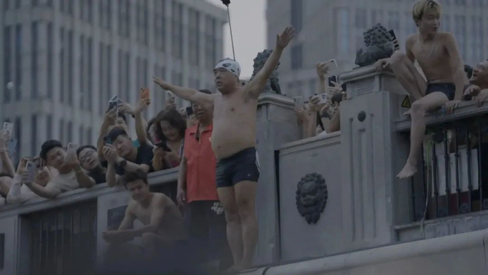狮子林桥距离海河水面7米,站在桥边看是一回事,站在桥上往下看是另一回事。总有人想抢占跳台的位置,但也不是每个人都能鼓起勇气跳下去。一个从北京来的年轻男人,皮肤白皙,一看就和每天在户外游泳的大爷们区别开来。他在桥边上足足站了十分钟,被人群嘘了两次都没敢跳下来。大爷们性子急,斥责他在台上故意磨蹭、占用「跳水资源」,还抹黑了狮子林桥「专业」跳水的招牌,有人喊他,「何方人士,报上名来!」