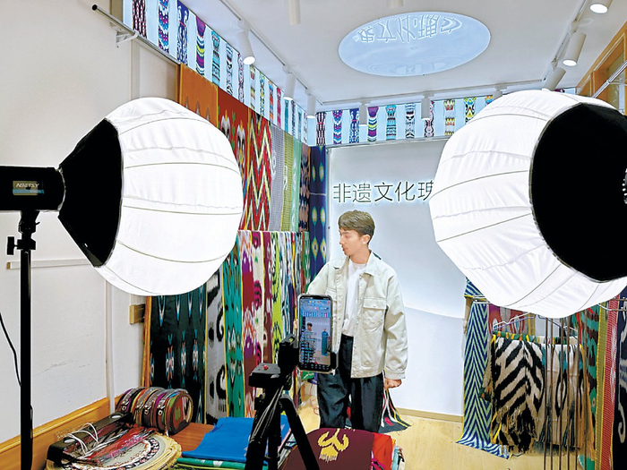 “像这样纯手工的艾德莱斯,做各种衣服都是可以的,刚刚开播人气还没有到,我给你们加一波福利好不好……”在和田市吉亚乡吉亚丽人艾特莱斯丝绸有限公司,维吾尔族小伙努尔正通过短视频平台直播带货,吸引了不少顾客在线选购这一新疆传统手工艺品——艾德莱斯丝绸。