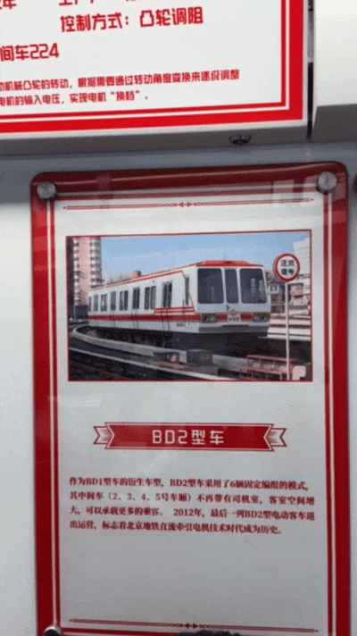 车厢内张贴着科普展示海报,介绍北京地铁车辆技术发展历程。乘客在车厢中既能看到地铁开通初期的线路图,富有年代感的标志、车票、风扇罩等老物件,也能通过播放着视频的“魔窗”感受智慧地铁时代的新景象。