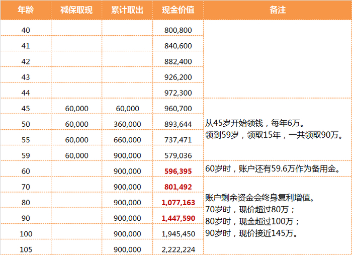 在此期间,如果额外需要用钱,也可以多取一些用来应急,但要注意额度,保证剩余现金价值能支持60岁前的取现计划。