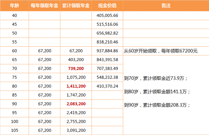 从60岁开始领取,每年能领67200元,活到100岁领到100岁,是真正的终身被动收入。