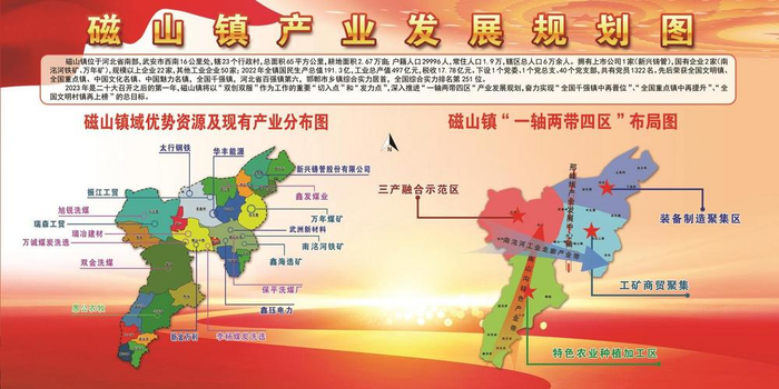 而这仅是磁山镇经济发展中的一隅,苗圃基地、鱼鸭鹅养殖基地、农业生态园等绿色生态项目也在不断崛起壮大,而这皆来自于磁山镇新一届党委、政府谋划制定的“一轴两带四区”产业发展规划:“一轴”即以邢峰线作为发展中心轴;“两带”即南洺河工业走廊产业带和南山沟特色农业产业带;“四区”即工矿商贸聚集区、装备制造聚集区、三产融合示范区、现代农业示范区。