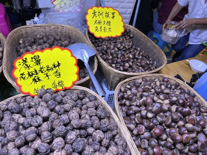 篆新农贸市场作为昆明网红菜市场,每天顾客络绎不绝,售卖的产品种类丰富,不少摊位上都有新鲜板栗的身影,红棕色的外壳、饱满的果实,看起来很不错。