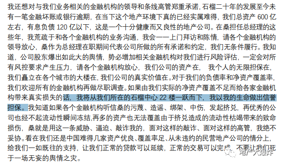 如果由我们实际的净资产覆盖不足而给各家金融机构带来真实损失的话,我将从我们所在的石榴中心 22 楼一跃而下,我以我的生命做出信誉担保。