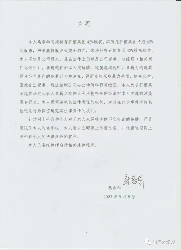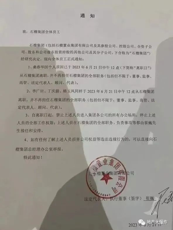 通知上写着桑春华因个人原因离职并不再担任石榴集团的全部职务,而与桑春华关系密切的几位公司高管也全被解除了职务。