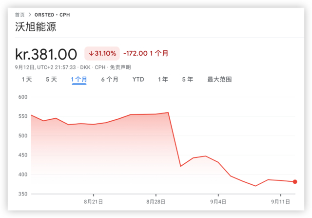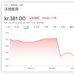 8月份,丹麦最大海上风电开发商沃旭(Ørsted)公告称,预计其美国资产价值减计160亿丹麦克朗(约23亿美元),减记规模相当于公司迄今在美国海上风电市场投资的一半。此后,沃旭股价一路暴跌,过去一个月累计跌超30%,市值抹去730亿丹麦克朗(约110亿美元)。