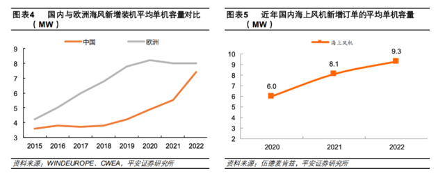 因此,平安证券认为,未来国内风机企业产品大型化速度还将继续领先欧美风机巨头,推动单机容量优势的扩大和成本差距的扩大。随着国内风机产品性价比优势的扩大,国内风机企业将逐步抢占欧美风机巨头的市场份额。