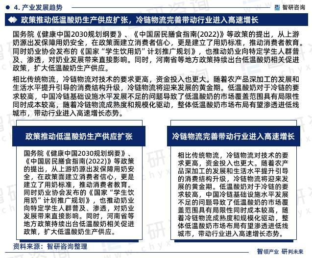 国务院《健康中国2030规划纲要》、《中国居民膳食指南(2022)》等政策的提出,从上游奶源出发保障用奶安全,在政策面建立消费者信心,更是建立了用奶标准,推动消费者教育。同时奶业协会发布的《国家“学生饮用奶”计划推广规划》,也推动奶业向特定学生人群普及、渗透,对奶业发展带来直接影响。同时,河南省等地方政策持续出台低温酸奶相关促进政策,扩大低温酸奶生产供应。