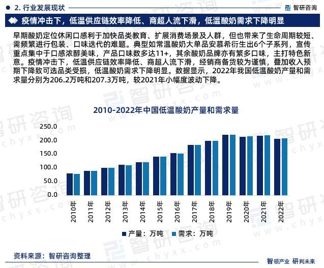 早期酸奶定位休闲口感利于加快品类教育、扩展消费场景及人群,但也带来了生命周期较短、需频繁进行包装、口味迭代的难题。典型如常温酸奶大单品安慕希衍生出6个子系列,宣传重点集中于口感浓醇美味,产品口味数多达11+,其余酸奶品牌亦有繁多口味,主打特色新意。疫情冲击下,低温供应链效率降低、商超人流下滑,经销商备货较为谨慎,叠加收入预期下降致可选品类受损,低温酸奶需求下降明显。数据显示,2022年我国低温酸奶产量和需求量分别为206.2万吨和207.3万吨,较2021年小幅度波动下降。