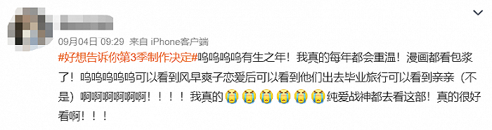 近日,《好想告诉你》官推宣布了动画第三季制作消息,预计2024年独家上线Netflix。此时距离前作动画第二季的播出,已经过去十二年时间了。
