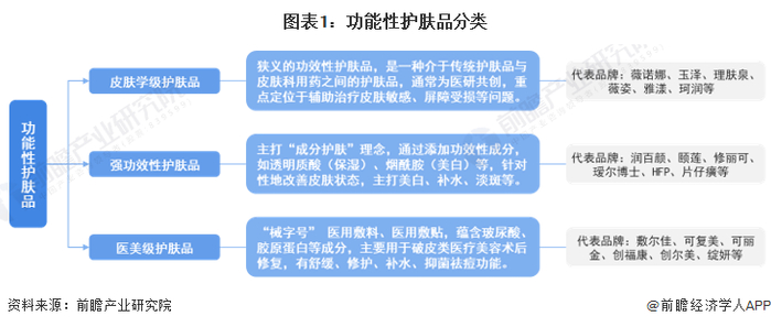 功能性护肤品指针对性地缓解或辅助治疗某些皮肤问题的一类化妆品(妆字号)或医疗器械(械字号),具备一定药理作用,行业正处于国产品牌崛起阶段。根据护肤品功能及功效的不同,功能性护肤品可分为皮肤学级护肤品、强功效性护肤品和医美级护肤品。