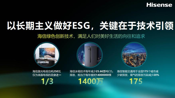 “以长期主义做好ESG,关键在于技术引领。”贾少谦表示,随着“双碳”战略的纵深推进,对绿色技术创新提出了新要求。海信始终坚持“技术立企、稳健经营”的发展战略,重视研发基础性、原创性、颠覆性的绿色创新技术,满足人们对美好生活的向往和追求。海信主导并引领的激光电视就是其中一项代表性技术,功耗仅为同尺寸液晶电视的三分之一。随着激光电视在全球的热销,对节能降耗的作用将是全球性的,而且会持续增长。