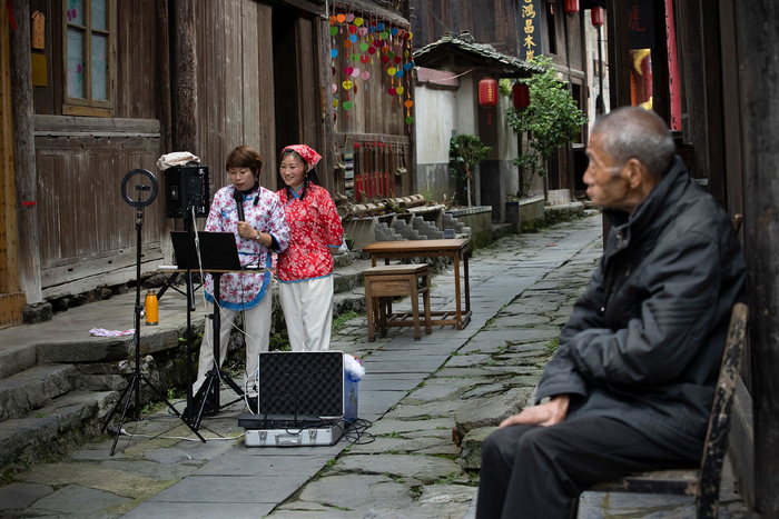 唐家观古民居前,几位村民在展示安化黑茶拣茶工艺(安化县委宣传部供图)
