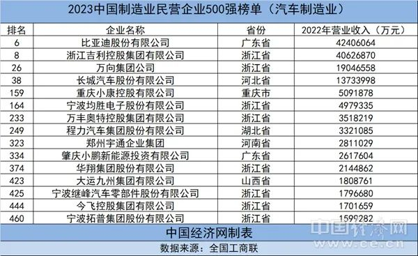 中国经济网9月13日讯(记者 郭跃)昨日,中华全国工商业联合会发布“2023中国民营企业500强”榜单,共有9家汽车制造业民营企业入榜。