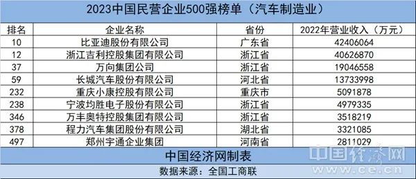 2023中国民营企业500强:9家汽车制造业企业入榜