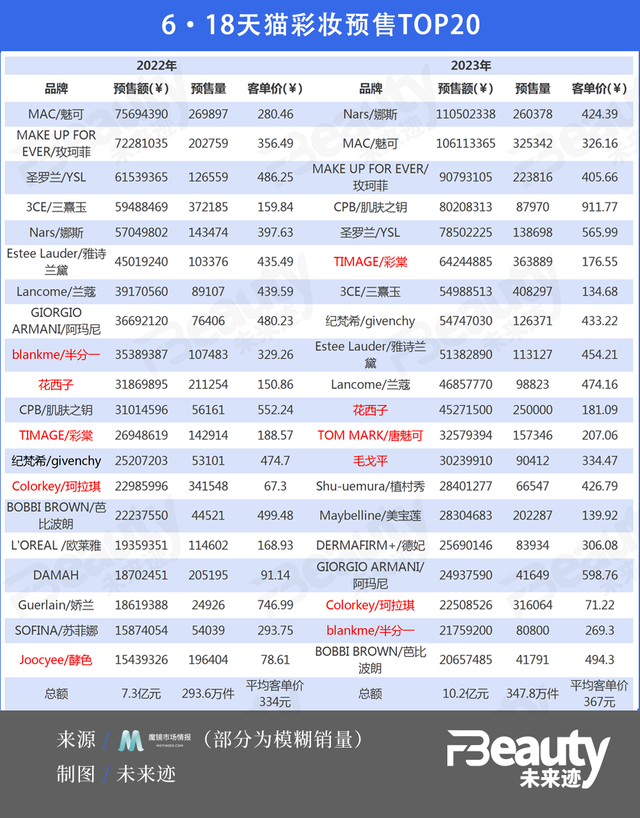 《FBeauty未来迹》总结出6·18天猫平台预售阶段(5月26日晚8点~5月31日0点)的10张品类和单品榜单。在彩妆品类里,相比2022年,今年一个显著的对比是,彩棠跃升,花西子下滑。