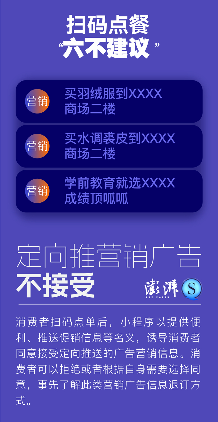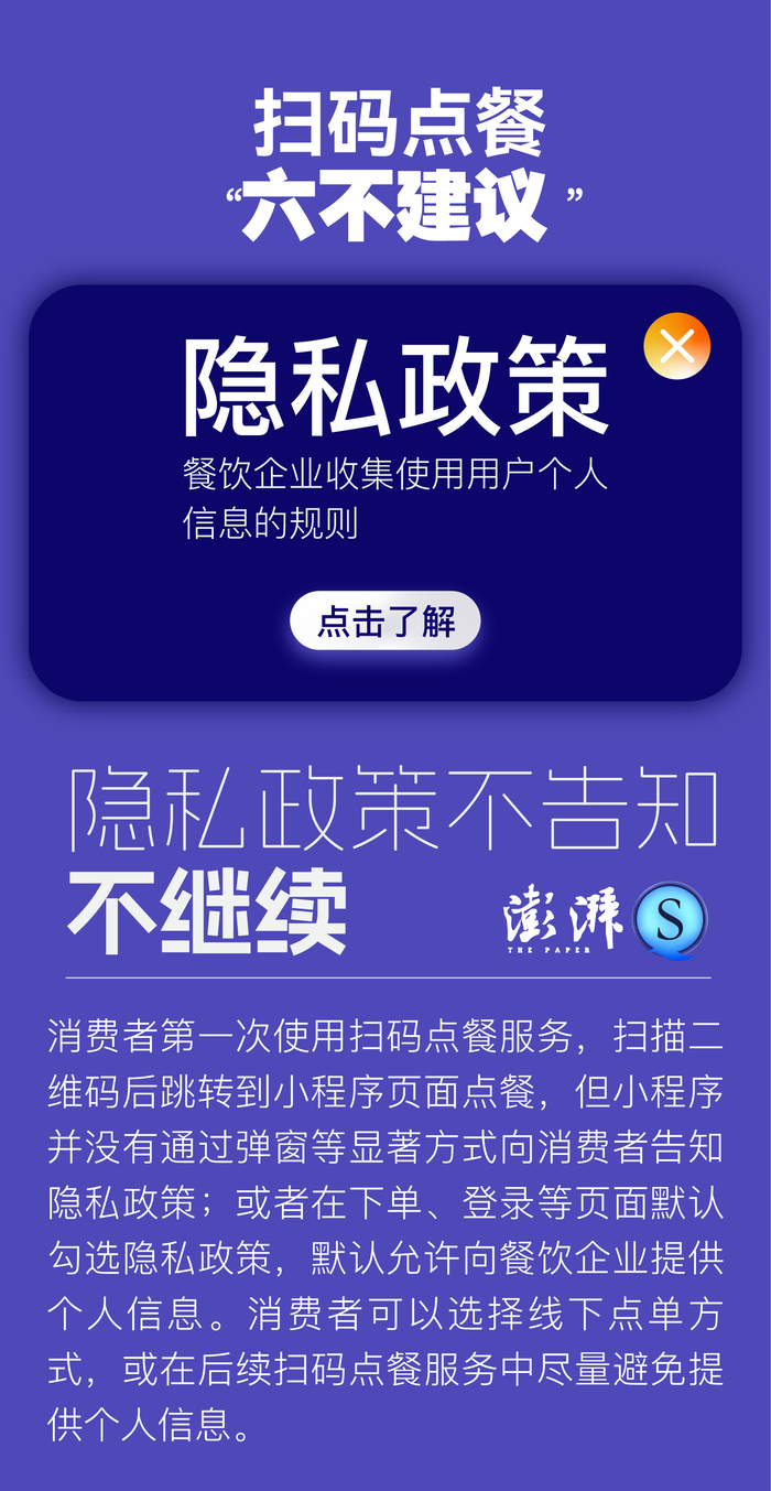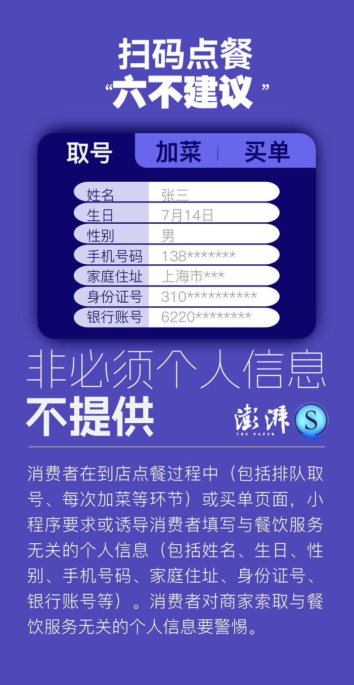 为了更好地帮助消费者在扫码点餐时加强个人信息防护,2023年7月,上海市网信办提出“六不”建议,希望社会公众共同提高个人信息权益保护意识。