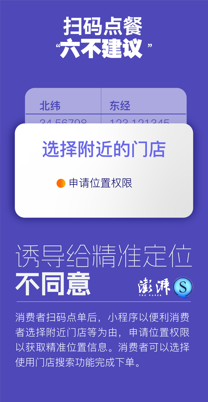 消费者扫码点单后,小程序以优化服务体验、提供会员折扣等名义,反复出现弹窗申请,诱导消费者授权精准位置或手机号等个人信息,或者诱导消费者关注企业公众号。消费者可以根据自身选择服务的需要谨慎提供个人信息。