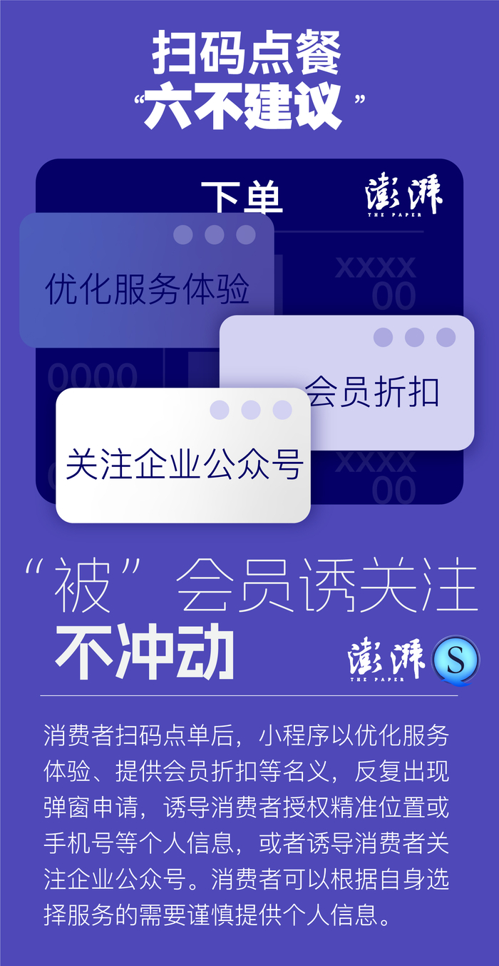 上海市网信办相关负责人指出,此类默认消费者同意的“0元入会”行为,意图通过“迷惑性”业务流程诱导消费者在不经意或未完全了解服务内容的情况下完成对企业的授权,违反了《个人信息保护法》的“告知同意”原则。同时建议广大消费者在扫码点餐时按照上海市网信办提出的“扫码点餐‘六不’建议”,对餐饮企业违法违规收集使用个人信息的行为勇敢说“不”。