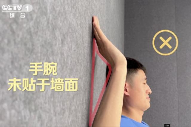 在滑动过程中,手背和肘关节与墙壁不能留有空隙,同时要求肩关节不能有疼痛,否则造成腰椎过度前倾。